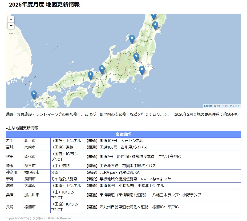 デジタル地図の整備・制作、および空中写真を含む空間情報コンテンツの販売を行うNTT インフラネット株式会社 (本社︓東京都中央区日本橋一丁目8 番1 号 ネクストサイト日本橋ビル 代表取締役社長 上原 一郎)は、2月初旬までの更新を2026 年2 月26 日に行いました。