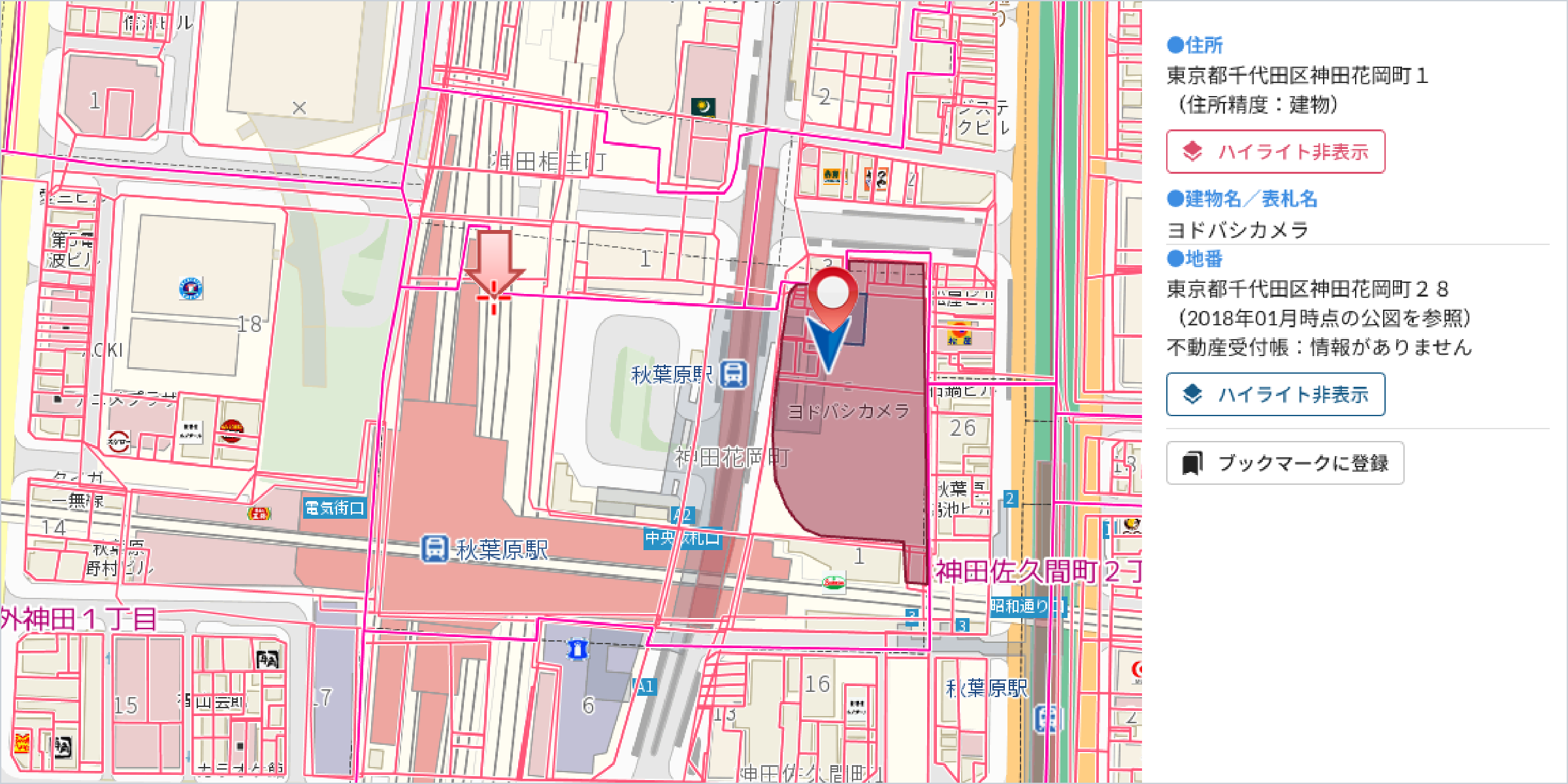弊社電子地図の建物住所との重ね合わせにより、どちらか一方しかわからない場合でも住所と地番の相互検索が可能です。