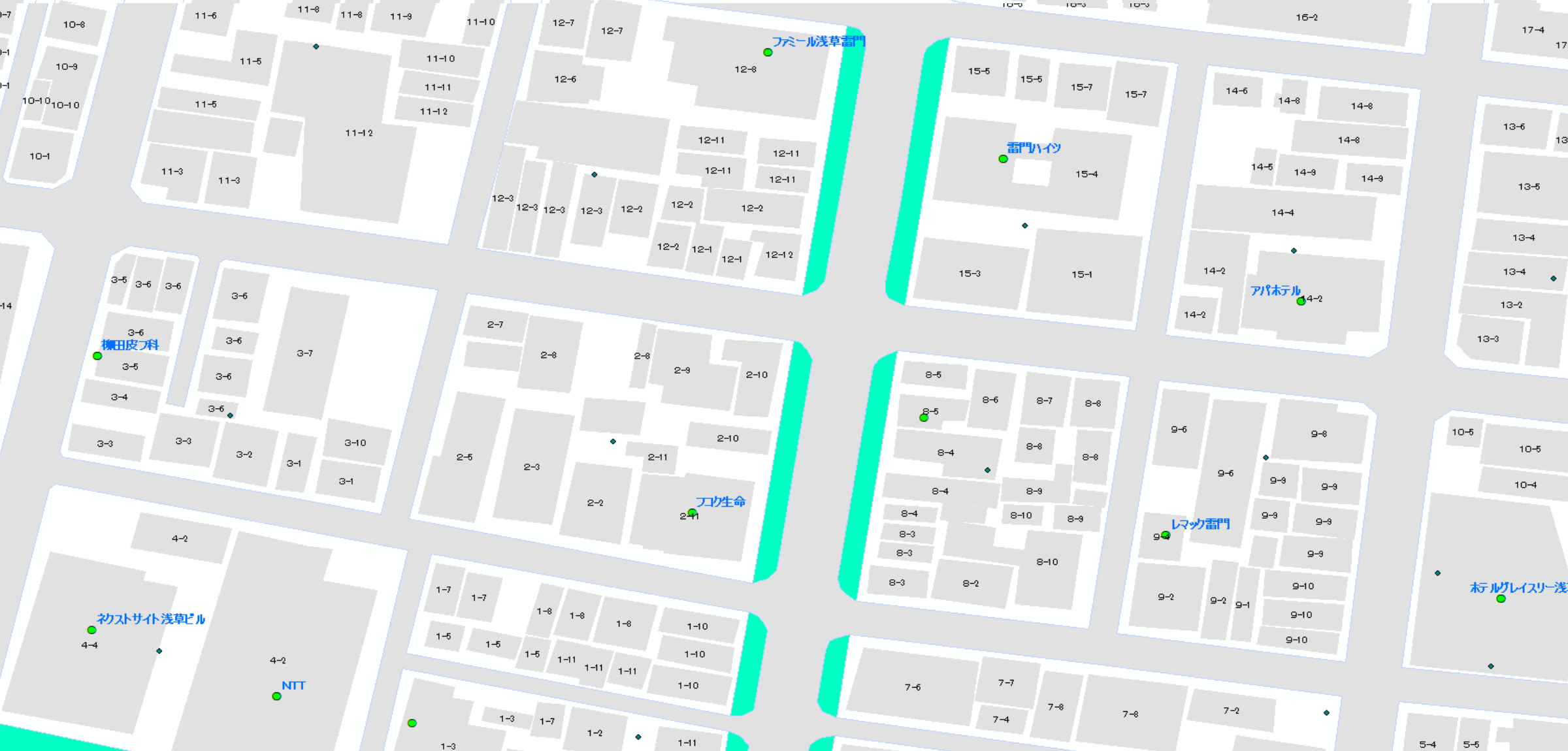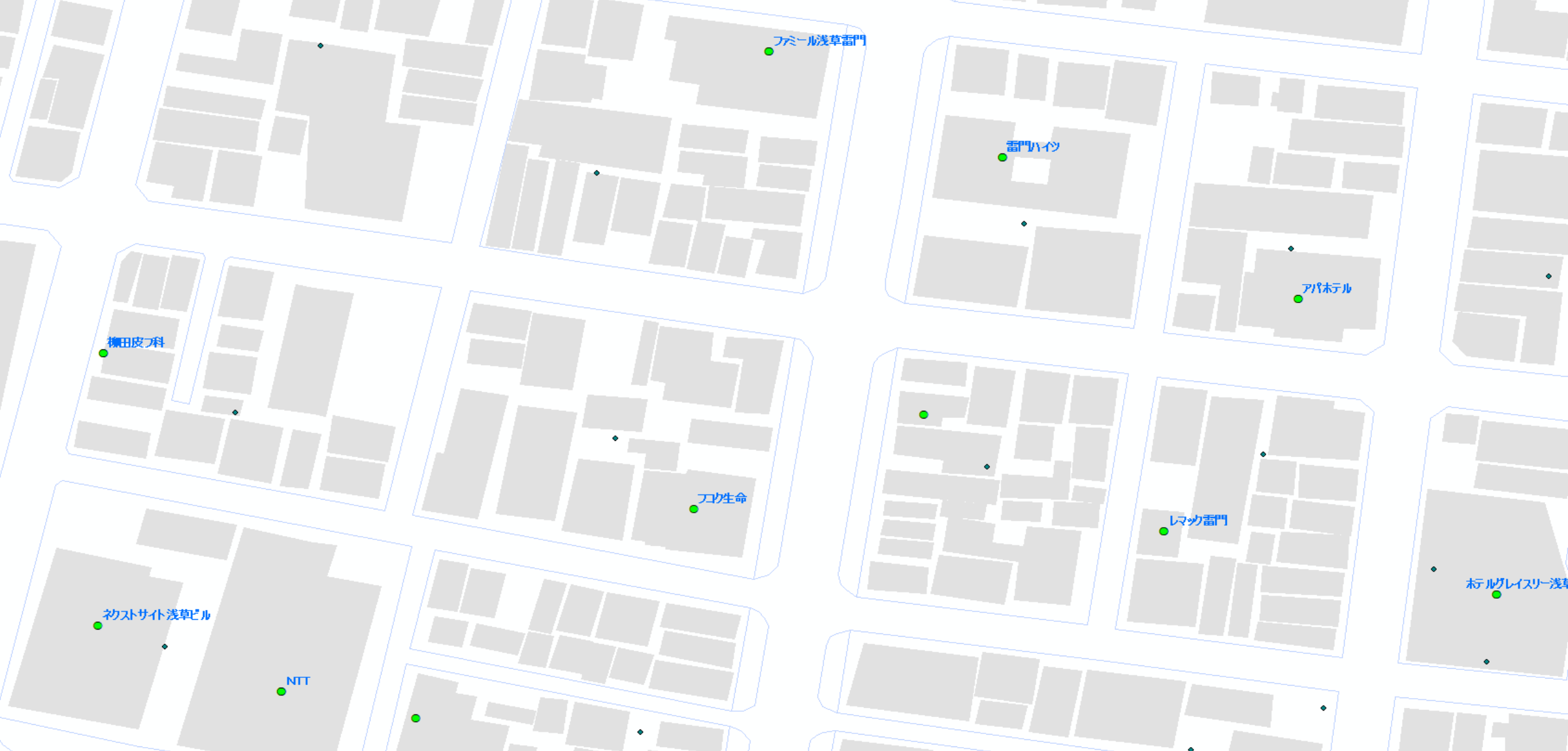 目標建物や一般家屋などの建物レイヤ、建物毎の番地号レベルの住所情報をはじめ、河川、湖、等高線、道路、鉄道や学校、病院、銀行などの記号も含め様々な情報を整備しております。