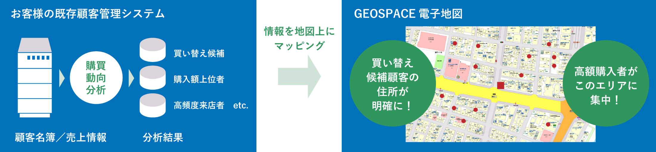 お客様が独自に保有されている顧客情報や拠点情報、設備管理情報、物件管理情報といった各種データに含まれる住所情報と、GEOSPACE 電子地図の住所情報を統合することで、地図画面上に正確に位置をマッチングし表示。ビジネスを高度にサポートする、高付加価値な戦略MAPとしてご活用いただけます。